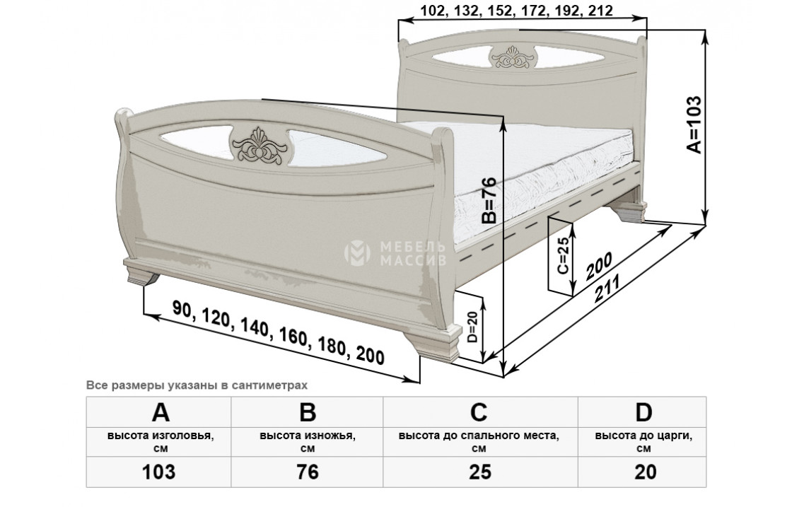 Кровать Эльза имеет две идентичные спинки, отличающиеся аккуратной изогнутостью, декоративными углублениями и цветочными узорами. Изделие, которое можно купить по специальной цене в нашем интернет-магазине, оснащено устойчивыми ножками, защищающими напольное покрытие от повреждений. Осуществляется доставка на дом по Новокузнецку и Кемеровской области.| Размер | Цена | |